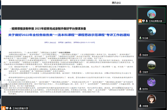 会上,王伟老师首先传达了教务处关于做好2022年全校各级各类“一流本科课程”“课程思政示范课程”考评工作的通知,明确了考评要求、质量标准和时间节点,对考评工作进行了动员部署。