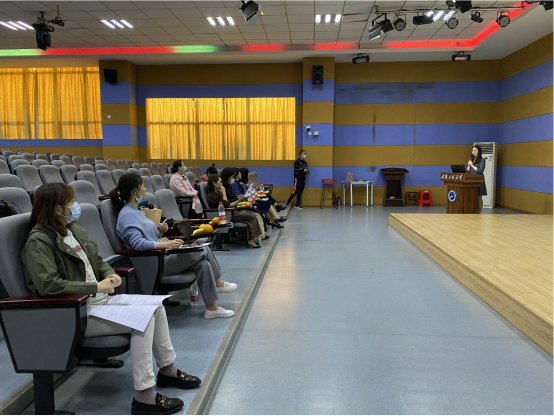 本次活动由大学英语第一教研室主任陈玢主持。潘俊老师和李莎莎老师分别用全英文展示了大学英语读写课程和大学英语听说课程教学的各个环节的设计。充分展现了其教学素养和能力。