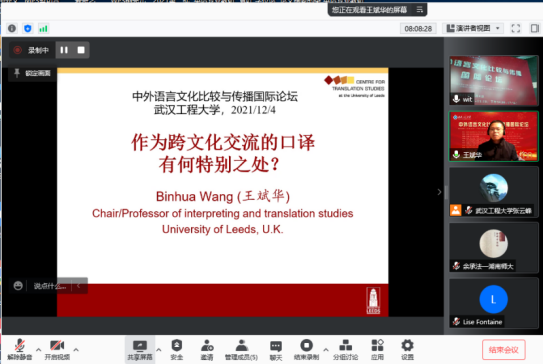 英国利兹大学博士生导师王斌华教授的发言主题为“作为跨文化交流的口译有何特别之处?”。王教授从口译是什么、口译员需要做什么、口译活动的意义何在等问题出发,对口译作为跨文化交流活动的特别之处进行了系统深刻的阐述。王教授指出,口译跨文化交流的特殊性可以从语言转换、信息处理、交际协调、社会文化等不同层面和维度进行考察。口译作为跨文化交流活动的性质凸显,促使学界对口译研究走向多元化,不局限于语言转换、信息加工等微观层面,而是从更为广阔的社会文化层面进行思考和探索。