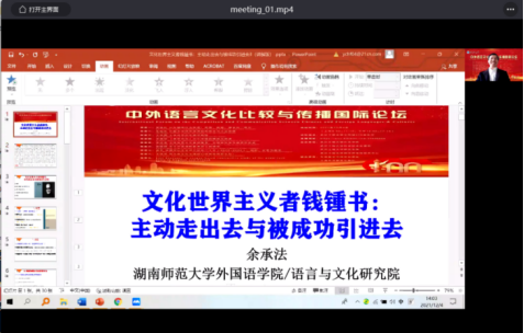 湖南师范大学博士生导师余承法教授的发言主题为“文化世界主义者钱锺书:主动走出去与被动引进去”。余教授基于详实的史料挖掘和爬梳,剖析钱钟书人生的三个时期,从两个阶段分析钱钟书的文化世界主义实践,历时回顾钱钟书的四次走出去和多次引进去,阐释了钱钟书作为文化世界主义者这一观点。余教授有关钱钟书文化世界主义者的发言对于我国语言文化如何“走出去”具有深刻的启示,贯通中外、融合文化、转化语言,文学和文化“走出去”的效果才能得以保证。