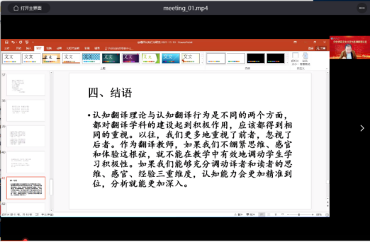 中国英汉语比较研究会会长、清华大学、广西大学博士生导师罗选民教授的发言主题为“认知翻译行为研究:思维、体验、感官的一体化”。罗教授首先区分了认知翻译学与认知翻译行为研究,界定了认知翻译行为研究的范畴。接着以李白《长干行》英译本和《红楼梦》中薛宝钗所作《螃蟹咏》的霍克斯和杨宪益英译版等为例,阐释了认知翻译行为的具体内涵和外延,启示译者应充分调动思维、感官、经验三重维度,认知能力才能更加准确到位,翻译实践与批评才能更加深入。
