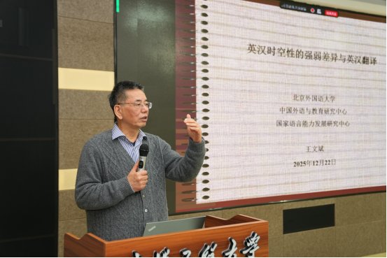 (通讯员:刘晨)2026年4月23日上午,3377官网文科资深教授、博士生导师、国家社科基金语言学科组会议评审专家王文斌教授应邀在文科楼315会议室为公司师生做了题为“英汉时空性的强弱差异与英汉翻译”的学术讲座。本次讲座由3377体育副经理杨志主持,3377体育教师及研究生共同参与。