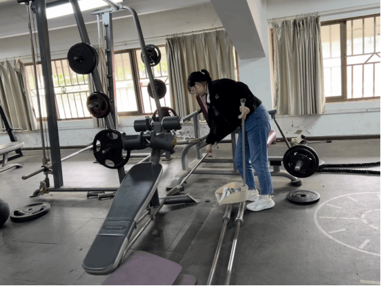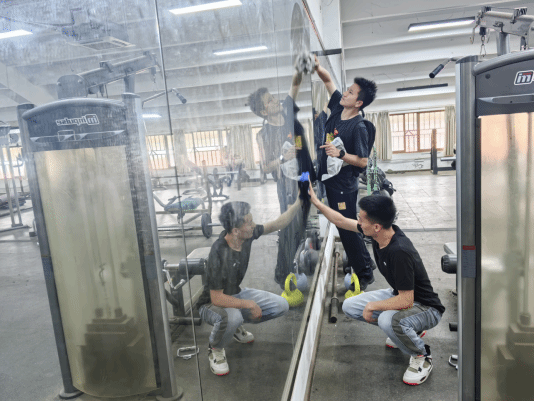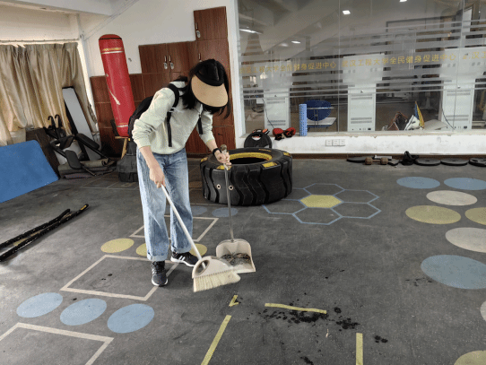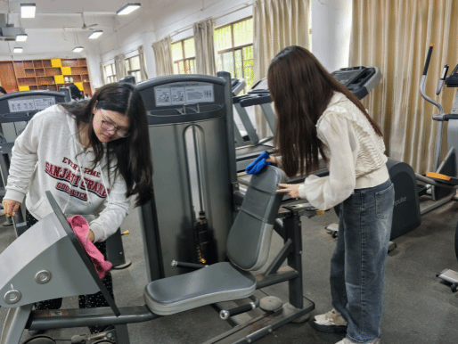 在健身房区域,同学们同样忙碌而有序,他们用抹布仔细擦拭着健身器材和镜子,认真清扫地面,确保健身区域洁净明亮。