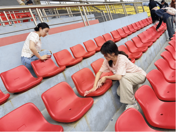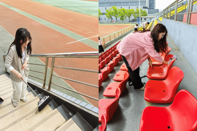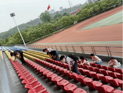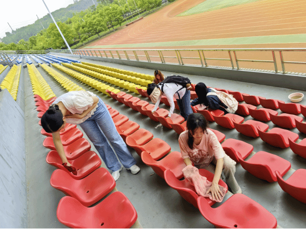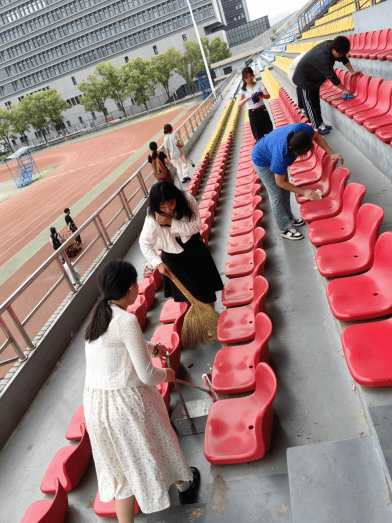 同学们对操场看台与健身房两个区域进行了清理打扫。在操场看台区域,大家各司其职,有的负责接水,有的忙着擦拭椅子,有的专注捡拾垃圾、清扫地面。他们认真地清理每一个角落的垃圾,细心地擦拭每一个座椅,确保看台区域的椅子洁净如新,地面一尘不染。