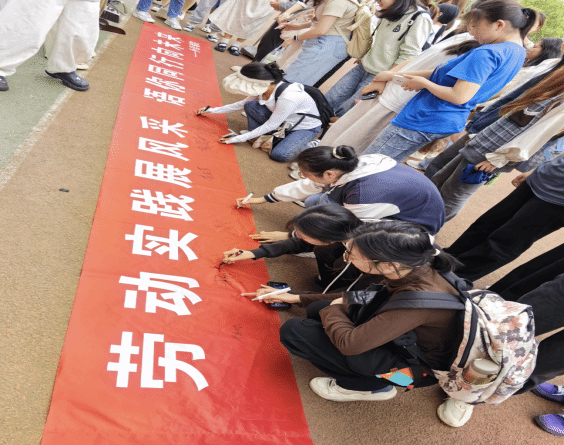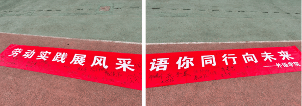 到达活动场地,公司党务干事周贝向大家阐释了劳动实践的价值和意义,帮助同学们明确参与劳动的重要性,树立正确的新时代劳动观,组织同学们在活动横幅上签名留念。