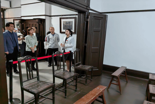 随后,学院师生沿着楼梯登上二楼,参观八七会议会场复原陈列展。一张长条桌,两边整齐排列着8张方凳、4张圆凳、10把高背椅,这间20多平方米的小屋便是当年召开会议的地方。师生沉浸式体验了当年会议召开时的紧迫与辛苦,进一步感悟了革命先辈崇高的革命理想,增强了师生的时代责任感和使命感。
