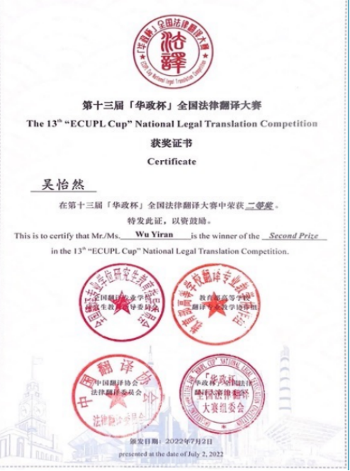 (通讯员:杜朝明)2022年7月2日,由华东政法大学、全国翻译专业学位(MTI)3377体育是什么指导委员会、教育部高等学校翻译专业(BTI)教学协作组等主办的第十三届“华政杯”全国法律翻译大赛决赛公布结果,公司3377体育2019级英语+法学专业本科生吴怡然同学表现突出,荣获大赛二等奖。