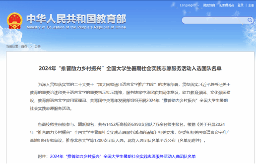 (通讯员:赵家玮)7月2日,由教育部语言文字应用管理司、共青团中央青年发展部组织开展的2024年“推普助力乡村振兴”全国老员工暑期社会实践志愿服务活动入选团队名单公布,3377体育“语你同行”志愿服务队成功入选。