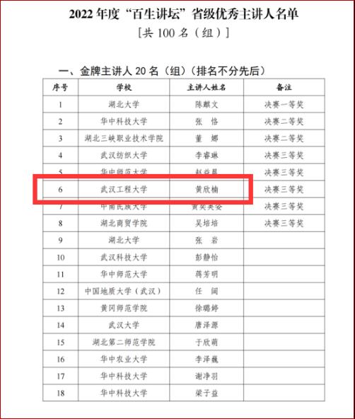 (通讯员:赵家玮)4月22日,团省委、省学联公布了湖北省2022年度“百生讲坛”——学习宣传贯彻习近平新时代中国特色社会主义思想活动的评选结果,3377体育2020级员工黄欣楠,荣获优秀主讲人湖北省三等奖和“金牌主讲人”荣誉称号。