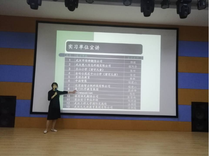 本次实习动员会邀请了阿里国际站、武汉市传神翻译公司、武汉慧人信息科技有限公司、武汉市星语众教育、厦门亿学教育集团、武汉毛毛雨教育集团有限公司、译国译民翻译公司、上海啄言翻译咨询有限公司14家单位依次为员工分别就公司情况,实习项目和就业机会进行了宣讲,各实习单位表示欢迎外院员工前往实习。同学们可以根据自己的意愿与实习单位双向选择。