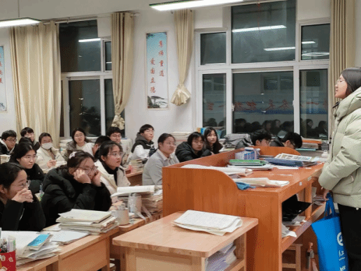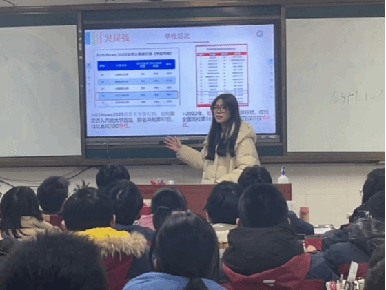 在回到高中母校开展宣讲前,2023级英语03班的何金蕾精心准备了很多小零食和礼物,以求吸引更多的学弟学妹关注。在入班宣讲时,何金蕾面向同学们进行PPT讲解,并细致解答了同学们的疑惑。介绍完毕之后,她还和学弟学妹们交流了学习经验,并激励他们调整心态,勇敢追梦,共赴“工大之约”。