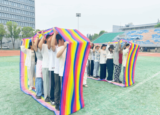 无敌风火轮游戏要求同学们将“小我”放在“大我”中,调整自己的节奏,适应团体的步伐。同学们8人一组,滚动彩带向前行进。一轮轮滚动的圆环,如同一条旋转的“风火轮”。每队同学紧密配合、团结一致,增进了同学们之间的相互信任和理解。