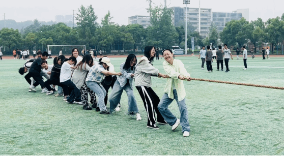 在拔河比赛中,随着一声哨响,活动现场瞬间沸腾起来。同学们在绳子两侧错开站立,勒绳、鼓劲、用力,喊着口号:一!二!一!齐心协力将绳子向后拉。场下的观众则热情地为他们加油鼓劲。口号声此起彼伏,所有参赛的同学都紧跟着统一的节奏,共同发力,为荣誉而战。