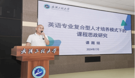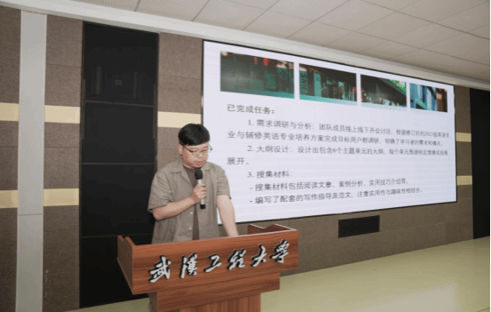 王伟老师团队的项目是《实用英语读写教材编写》,他报告了《实用英语读写教材》的编写情况,总结了前期工作,包括修订2023版英语专业培养方案、确定团队成员、明确编写对象、确定体例等,列出了接下来要完成的任务,并明确了时间表,希望能如期完成教材编写,早出成果。