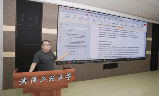 杜朝明老师团队的项目是《实用法律英语教程编写》,他就法律英语教程编写的背景进行了概述:在英语不是母语的情况下要学好法律,应如何使用相关原版材料。他通过举例来展现如何把英语原版案例与学校要求相结合,从而有效编写法律英语教材。