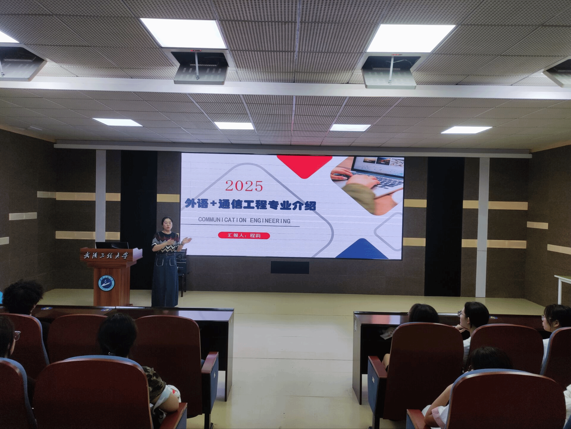 会议在同学们的期待中拉开了序幕。首先,程莉老师以“2025英语+通信工程专业介绍”为主题,从专业背景、课程体系、实践资源,就业前景等维度展开讲解,以通俗易懂的方式清晰的向大家解释了“通信工程专业到底是什么”“课程体系究竟是怎样”,同时承诺通信工程专业的所有课程和教学资源,包括先进硬件设备和资深团队指导,共享给同学们,全方位保障员工专业能力培养,让同学们切实感受到学校在专业建设上的硬核投入与育人诚意,加强了员工对该专业的理解。