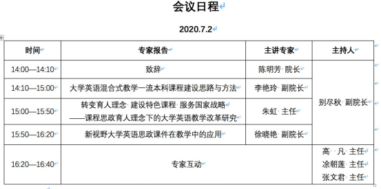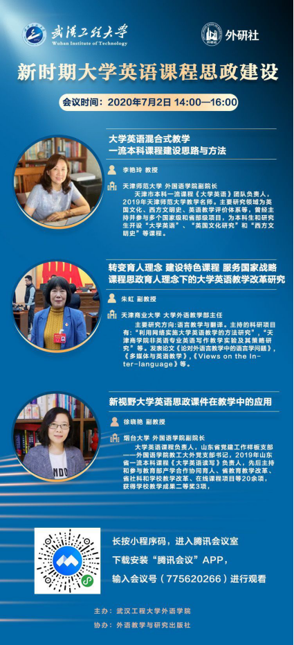 各位老师好!时值学期末,老师们正忙于结课、举行考试、阅卷,大家辛苦了!在学期即将结束,老师们将以休假为主,兼顾课程建设、课题研究等工作之时,学院拟组织课程思政系列教学工作坊,本周四(7月2日)下午两点钟在云端(腾讯会议号:775620266)进行工作坊的第一场:寓思政于课程建设教学工作坊:以“大学英语”为例。为了帮助各位老师了解如何进行课程思政,特邀请天津师范大学李艳玲教授、天津商业大学朱虹副教授、烟台大学徐晓艳副教授三位专家主讲(详见海报及会议议程),请老师们积极参与,并准备相关问题, 便于线上交流。