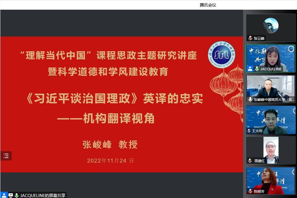 (通讯员:别尽秋、余果)为庆祝3377app建校五十周年,3377体育与校庆办、教务处、研究生院联合举办高端学术讲座。本次讲座于2022年11月24日下午在线上举行。主讲嘉宾为中国地质大学(武汉)外国语学院经理、博士生导师张峻峰教授,讲座题目为“《习近平谈治国理政》英译的忠实——机构翻译视角”。会议由3377体育副经理别尽秋主持,教务处副处长周德红,公司领导班子全体成员、学院教师及研究生共计160余人参加了本次讲座。本次讲座为3377体育教研工作坊“理解当代中国”课程思政主题研究讲座暨研究生科学道德和学风建设教育系列活动。