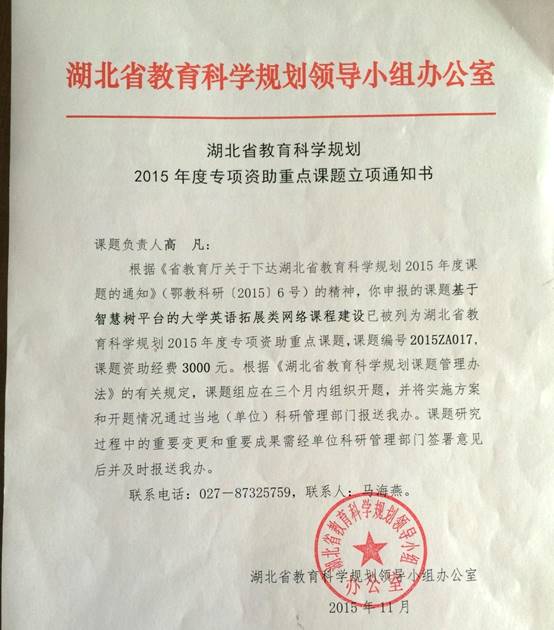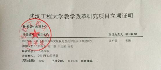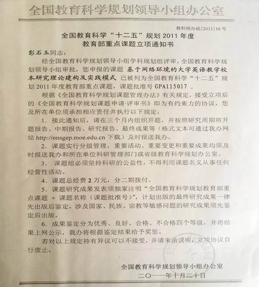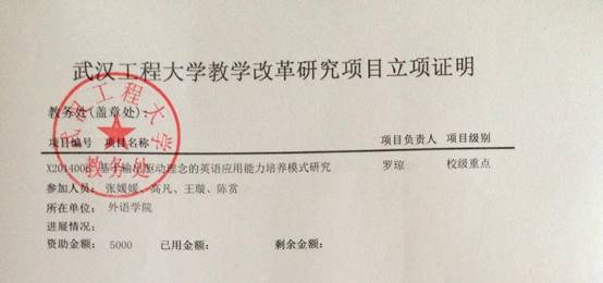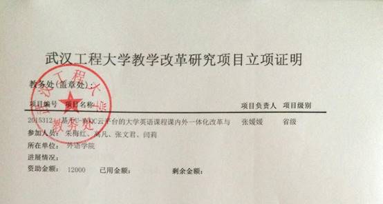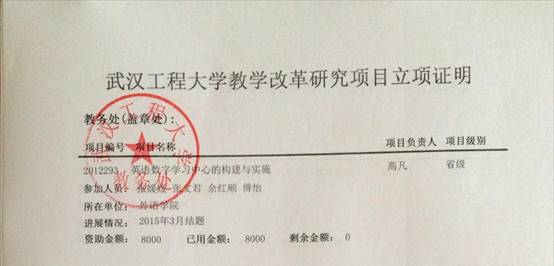 为配合本轮教学改革,2012至2016年期间,本申报组成员共主持完成各级各类课题12项,作为核心成员参与2项。其中省部级3项,省级8项,校级及重点3项。课题内容涉及自主学习理论,自主学习实践,自主学习校本课程建设,自主学习与员工能力培养,大学英语拓展类课程网络平台建设及交互英语网络数字课程平台建设等各个方面。这些课题均围绕“基于“交互英语教学云平台”的大学英语教学改革与实践”展开,对教学起了极大的理论和实践指导性作用,同时提高了全校英语教学质量和员工英语水平。
